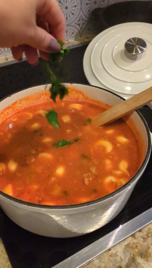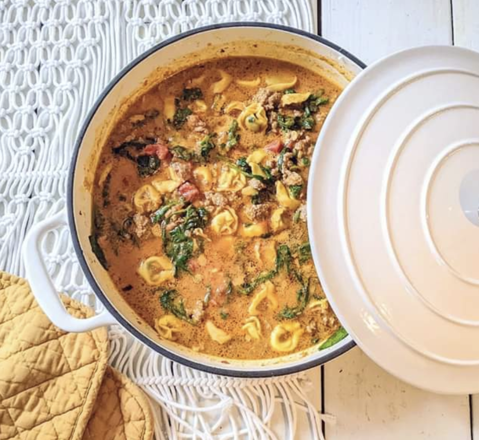 Sprinkle in Italian seasoning and crushed red pepper (optional) let simmer. Once tortellini is cooked through and nice and tender, add in cream cheese and turn down heat to simmer. Allow the cream cheese to melt into the soup. Serve with grated parmesan and some fresh basil leaves if you’d like! Enjoy!