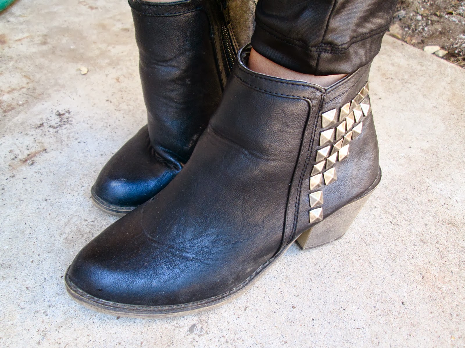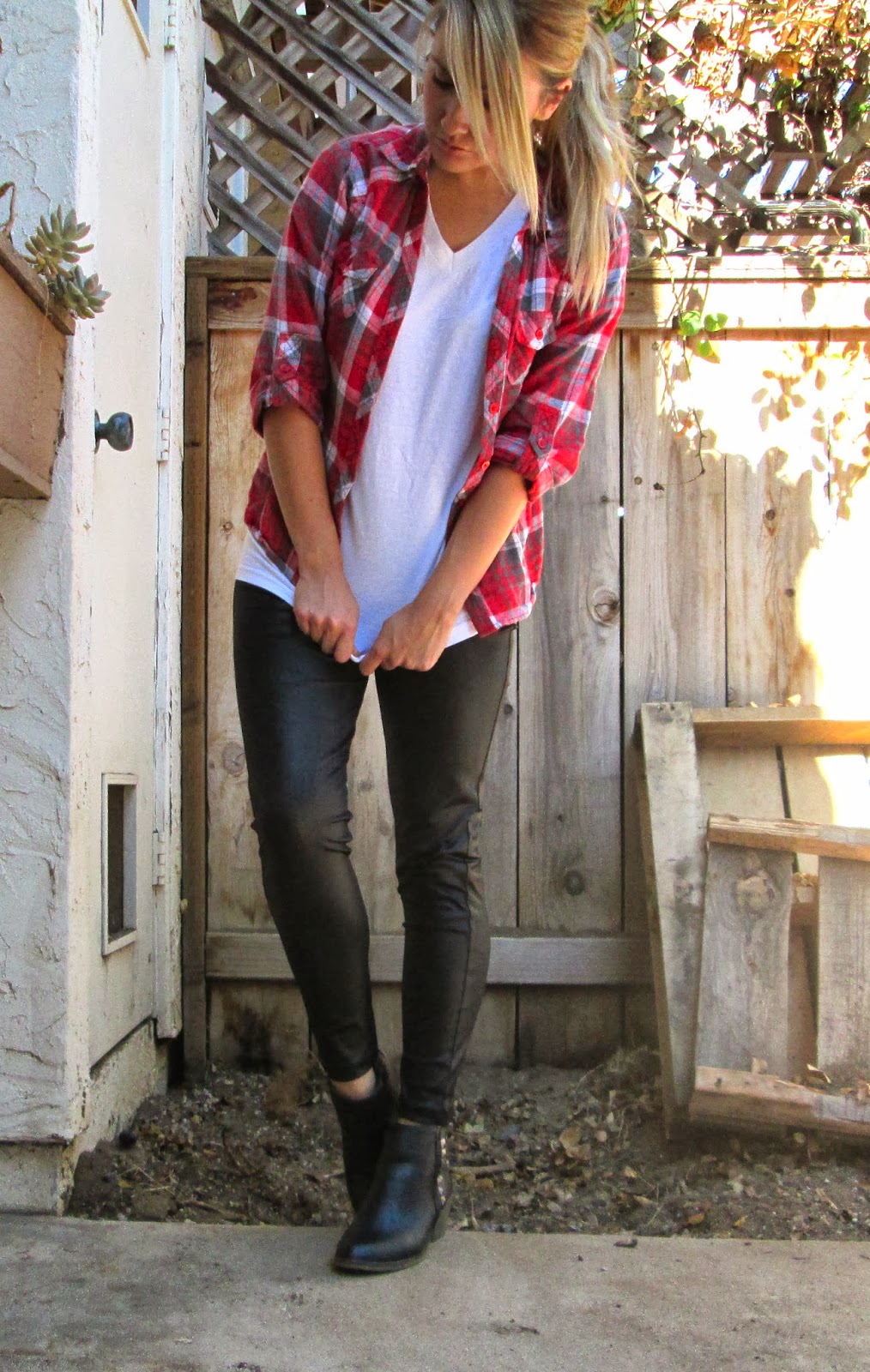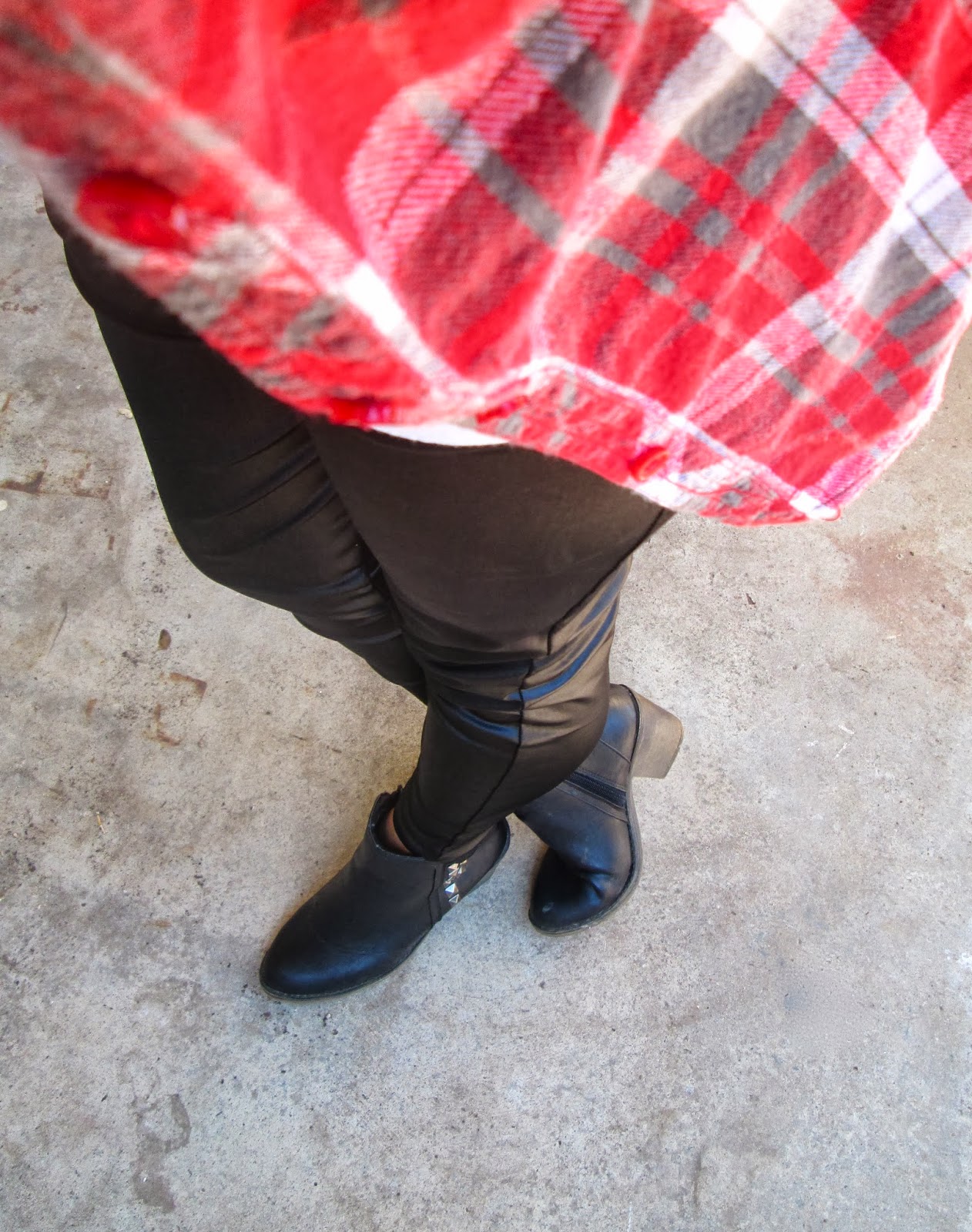 I stole, uh hum, borrowed my hubs white tee because mine have all been stained and torn in the trenches of raising 3 kiddos, ha ha. So, here is an example of how to wear that plain white tee and make it not so simple. I added a pair of black liquid leggings a.k.a. faux leather leggings and a fun flannel paired with black studded booties. This has been one of my go-to outfits all Fall / Winter because not only is it cute, but come on, they’re leggings, so I’m comfy!