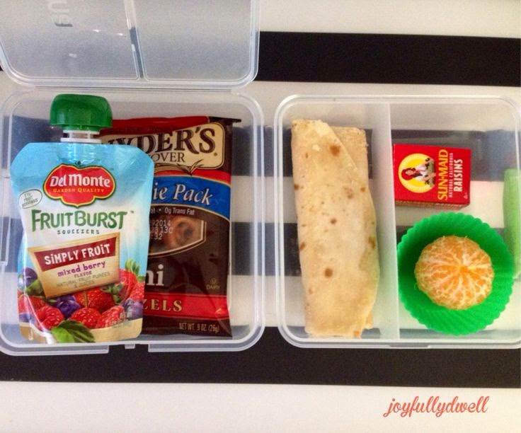 Fruit / veggie squeezer, pretzels, cheesy roll up (quesadilla in easier / portable form), raisins, orange and water |