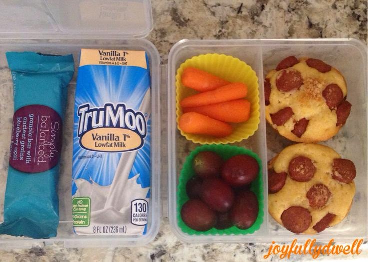 Granola bar, lowfat milk, carrots, grapes, and corndog muffins |
