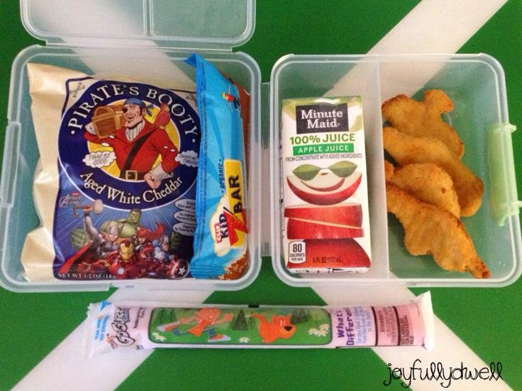 Pirate’s Booty aged white cheddar puffs, GoGo Squeez fruit and veggie pouch, sliced cucumbers, baby carrots, almond butter with crackers and hummus