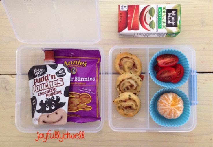 Chocolate pudd’n pouch, Cheddar Bunnies, Ranch Turkey Roll-ups, sliced cherry tomatoes, mandarin orange, juice box. |