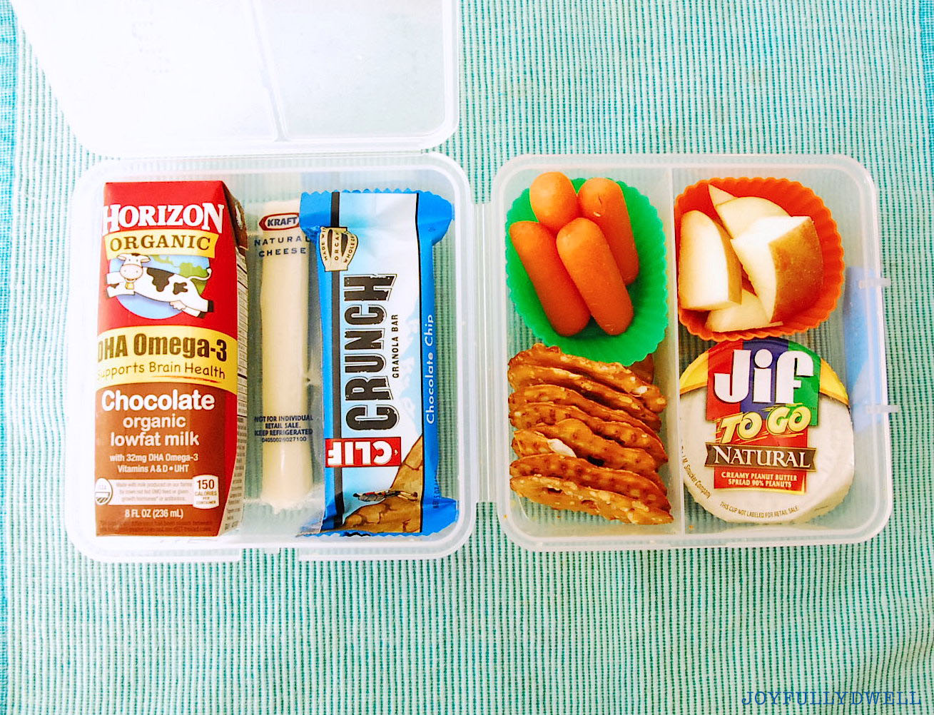 Chocolate milk, cheese-stick, CLIF bar, baby carrots, pretzel thins, peanut butter and apples