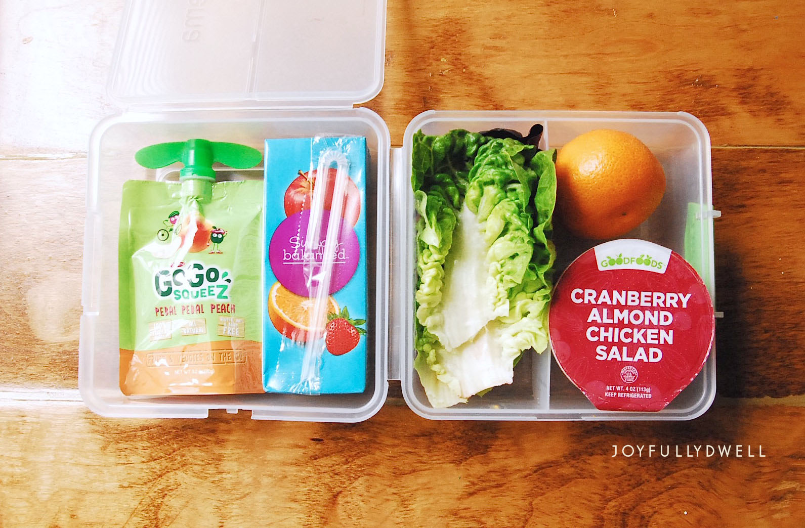 GoGo Squeez fruit and veggie pouch, 100% fruit juice, cranberry almond chicken salad and lettuce to make wraps and a mandarin orange