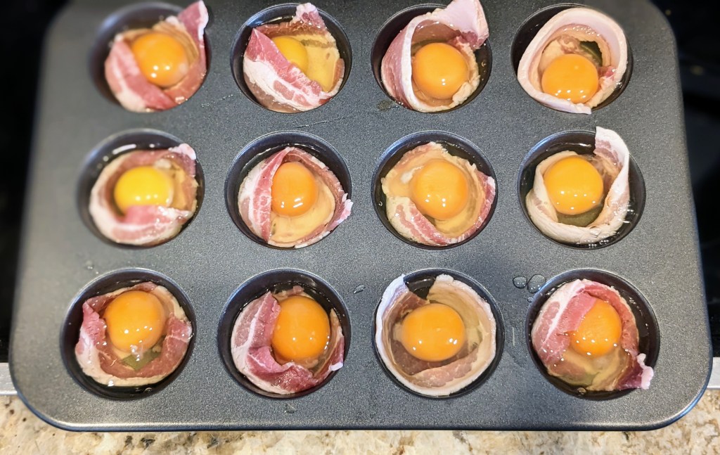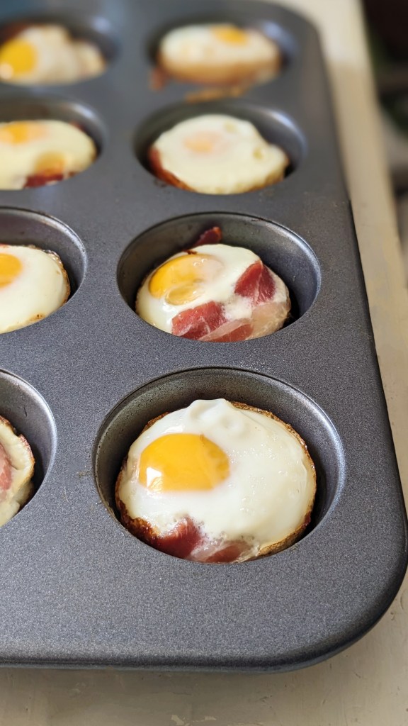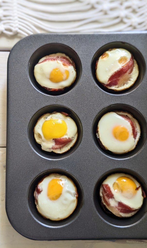 Preheat oven to 350 degrees. Assemble the muffins by first buttering each tins bottom layer. Place a round of bread in each tin. Wrap a piece of bacon around each bread round. Next comes the part my kids had a blast doing. Crack an egg for each tin and place it in the middle of the bacon and on top of the bread. Bake for 30-35 minutes and you’re done! Store them in your fridge and pop a couple in the toaster oven for 5 minutes before heading out the door. Bacon to go? I’m definitely keeping this one for the books!