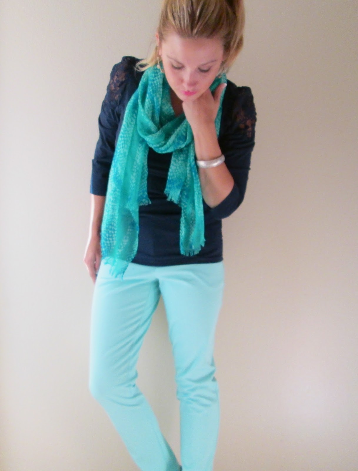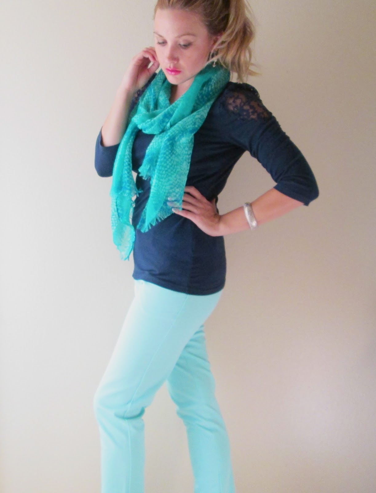 Here, I put together a Spring outfit using aqua and navy. I LOVE a good bargain, and better yet, a good outfit at a great price. I put this together for under $30, yes including the shoes and accessories! Aqua Pants :: Mossimo Target $8.38 // Navy Top :: H&M $6 // Turquoise Scarf :: Avon $3.99 // Black Pumps :: Ross $7.99 // Vintage Bangle :: Passed down. Total Look: $26.36