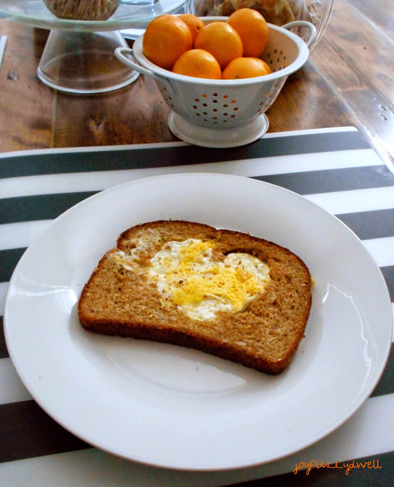 It’s so easy to make… just cut a hole in the middle of a piece of bread… I use a lid or cookie cutter. Butter a frying pan and set bread in. Crack open an egg into the opening, and fry it up to your liking.