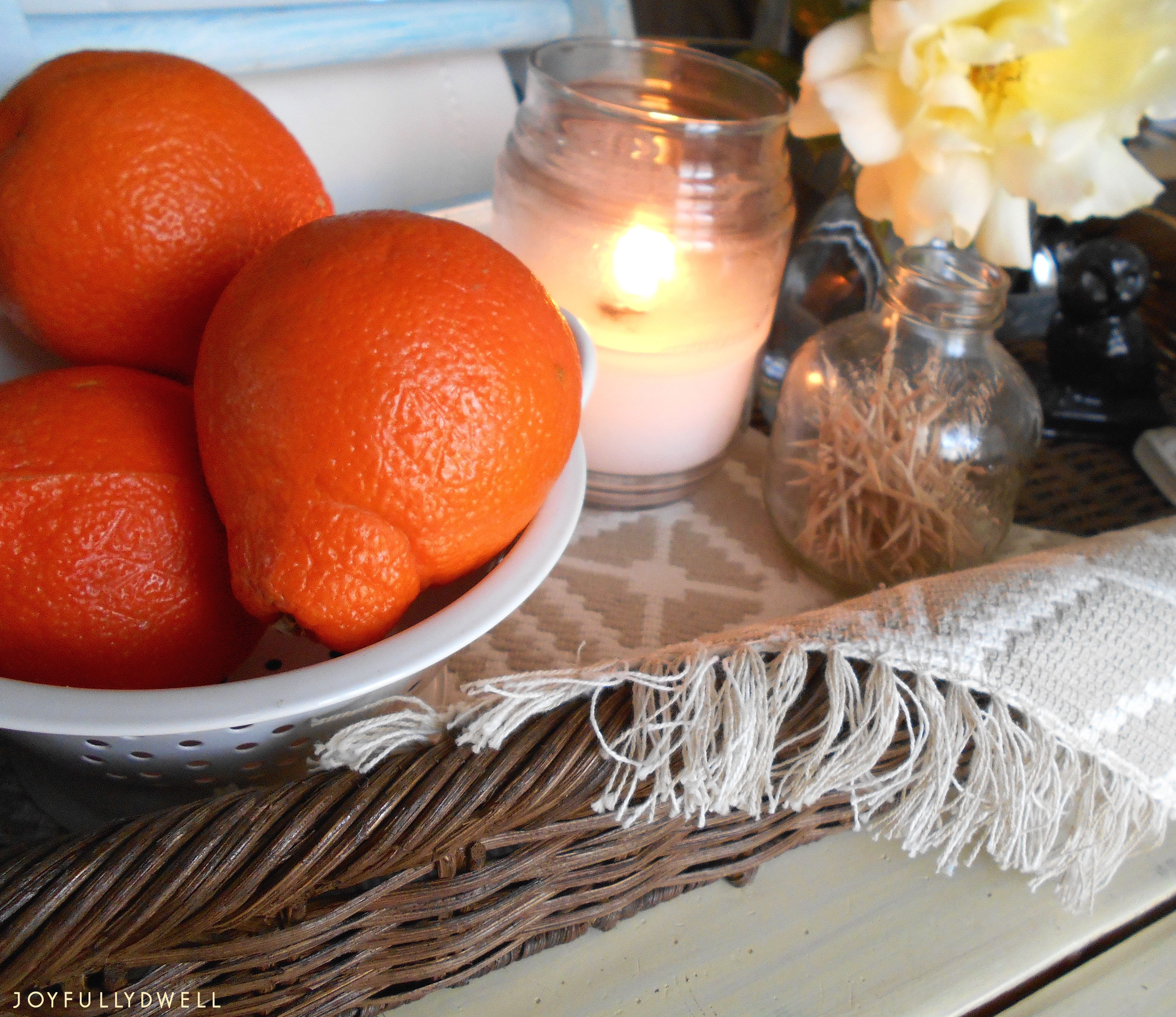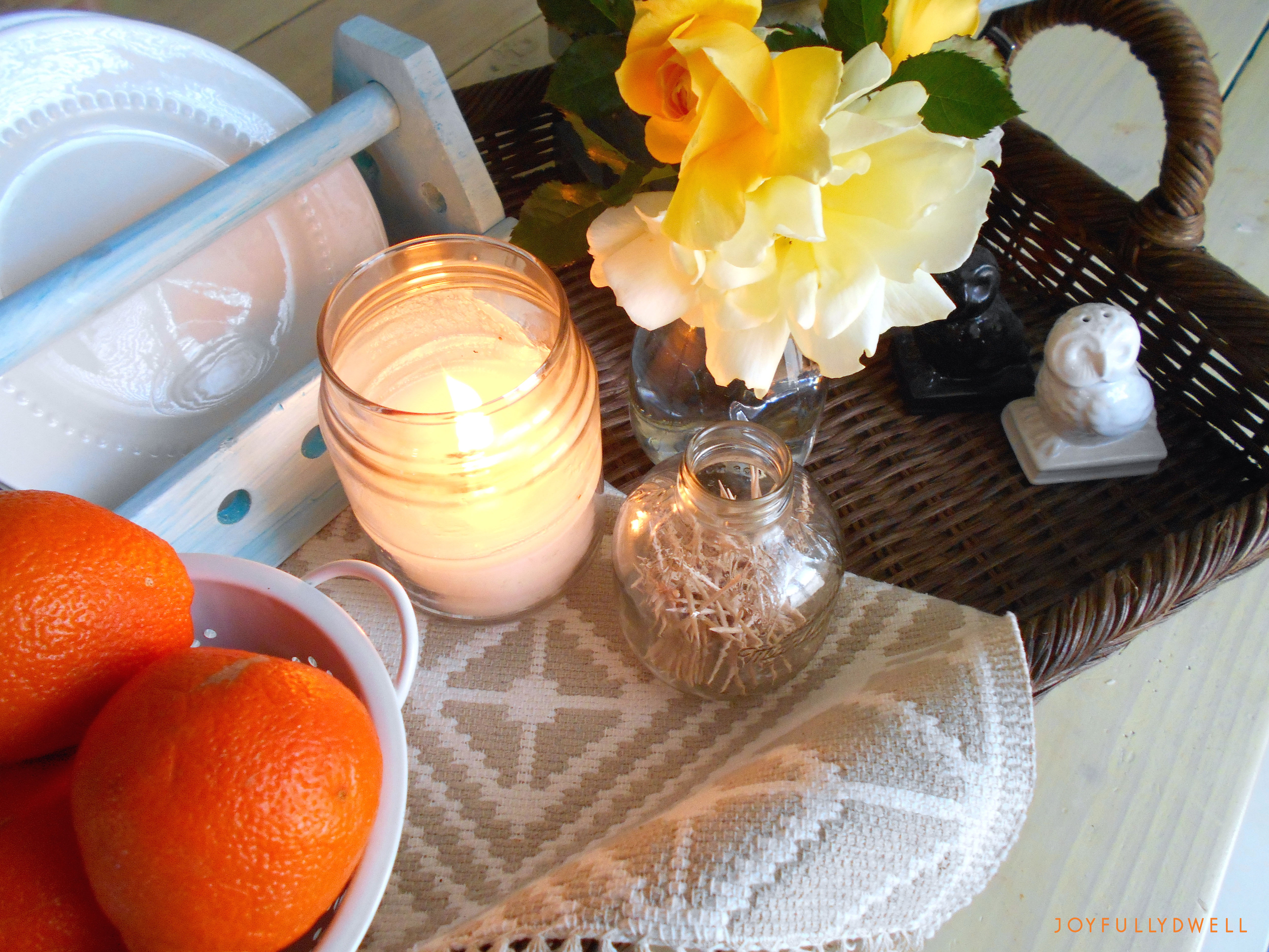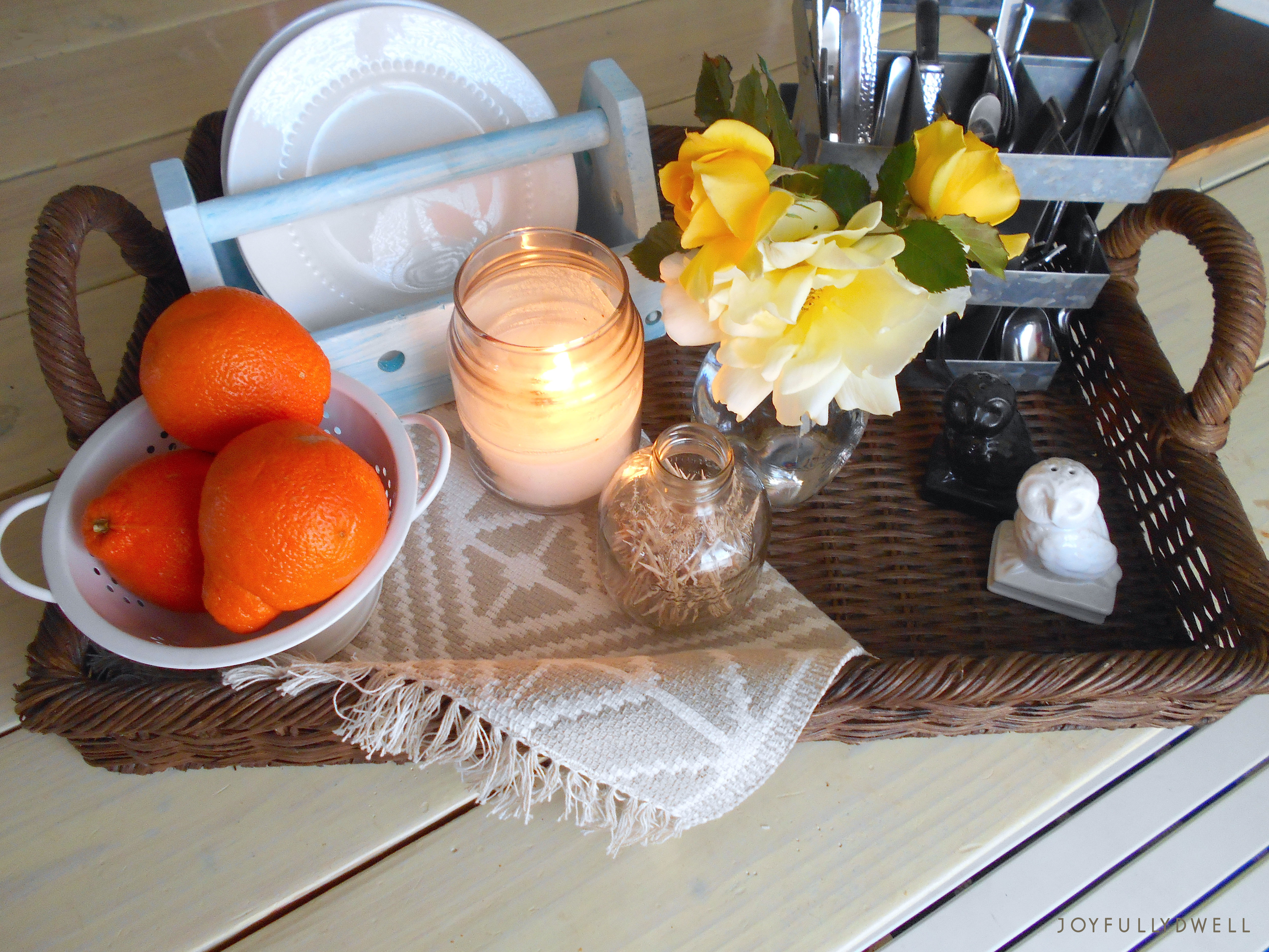 Spring is one of my favorite times of the year. The weather is warm, but not too hot, the landscape filled with the scenery of life blooming all around. Flowers, greenery, it all just makes me happy. Here is a dining table display or vignette using a rattan tray, some recycled bottles, fruits and flowers and other dining essentials. I hope it inspires you to create a lovely tabletop display as well!