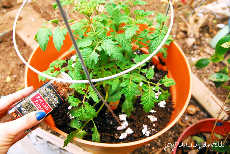 I start off by sprinkling epsom salts all around the plants. Epsom salt (aka magnesium sulfate) is an organic supplement for your soil. Without getting super scientific, I’ll simply explain… epsom salt enriches the soil by infusing it with essential nutrients the soil is lacking, thus strengthening the plants. I simply mix the epsom salts and soil with my hands. Next comes the defense… Eggshells! I use eggshells as an organic pest repellant. Slugs and snails keep FAR FAR away when there are sharp shells in their path! Some people prefer to grind up their dried eggshells in a blender. I much prefer to just crush them up in my hands and sprinkle them on the soil. It seems to be a better deterrent in my experience. Another step to keeping pests away is dried chili pepper flakes. But don’t accidentally mix this and touch your eyes! OUCH!