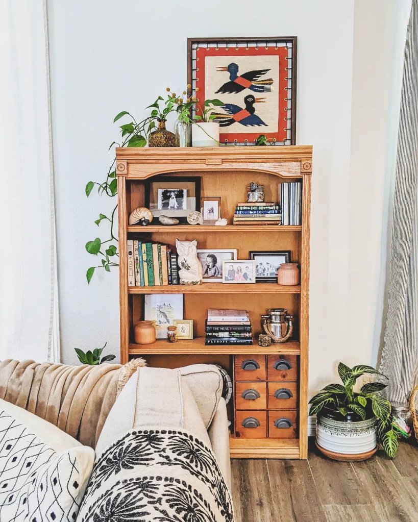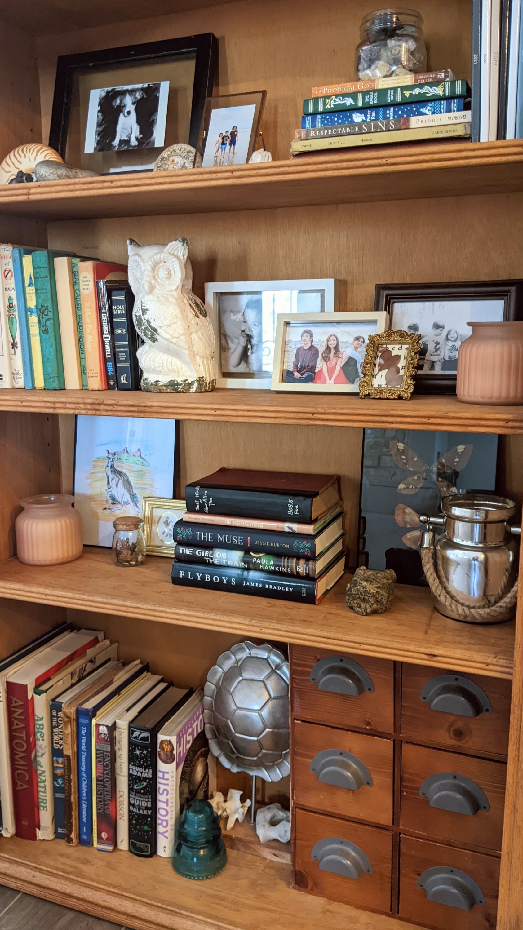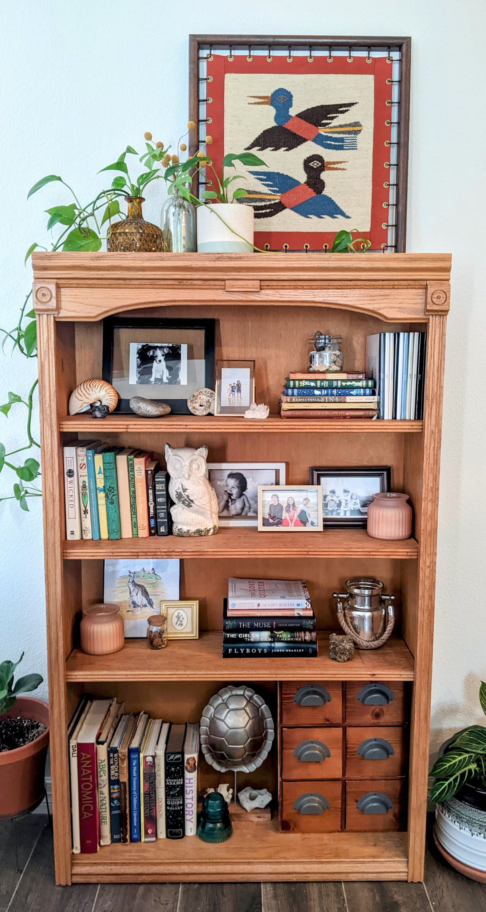 Sturdy wood furniture – this hand-crafted shelf was passed along to me from a friend. It’s solid, in lovely condition, holds our hefty books and allows us to display other items we’ve found or collected along the way.