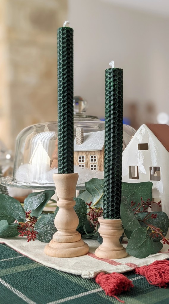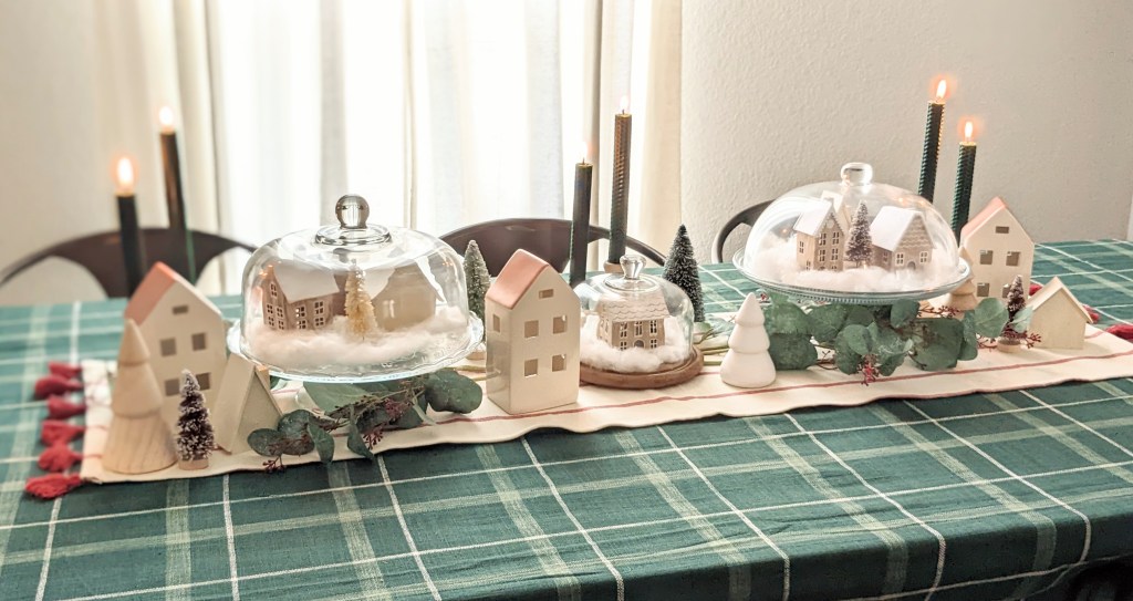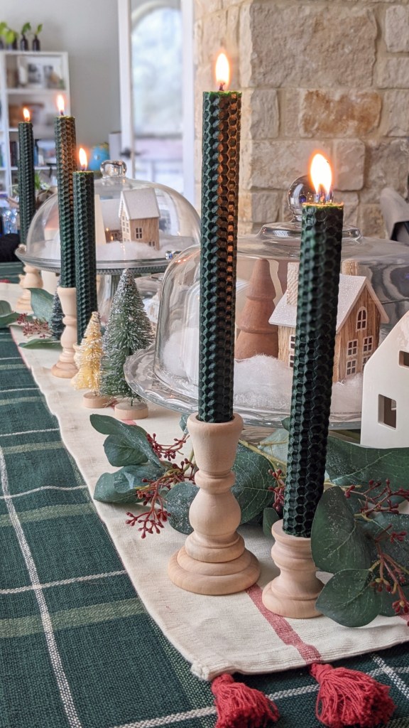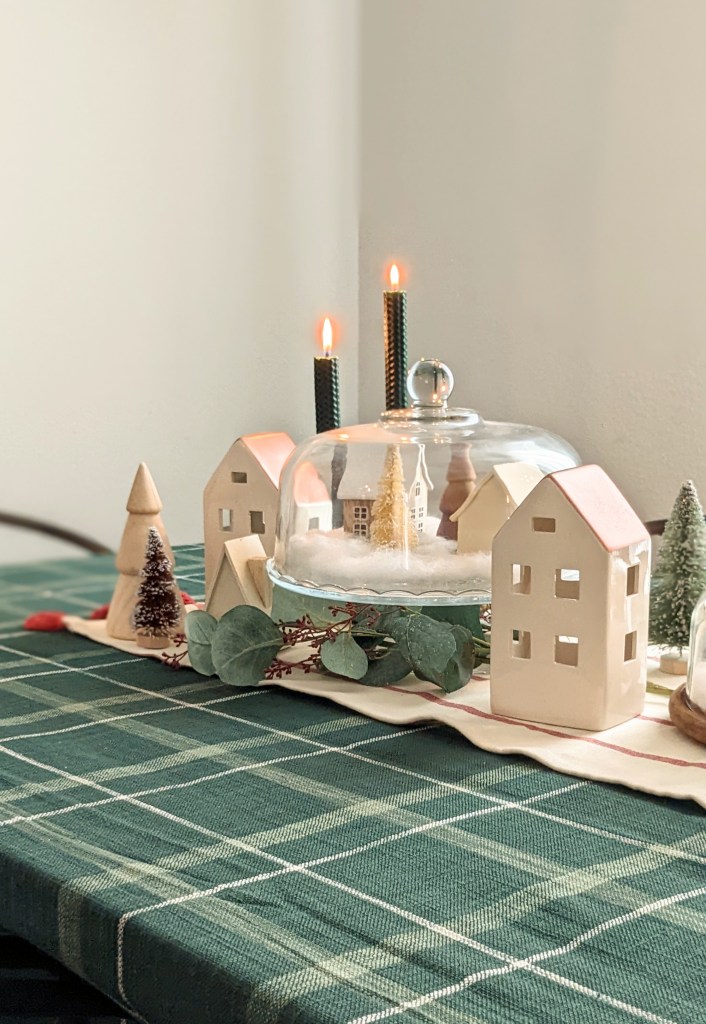 Neutral gingerbread houses, deep green beeswax candles and repurposed cake stands make up this minimal Wintry Wonderland.
