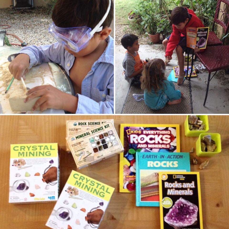 For our at-home learning, we read a lot of books about continents and landforms, journaled about the ones that were the kids’ favorites and had fun with different mining and geode kits.