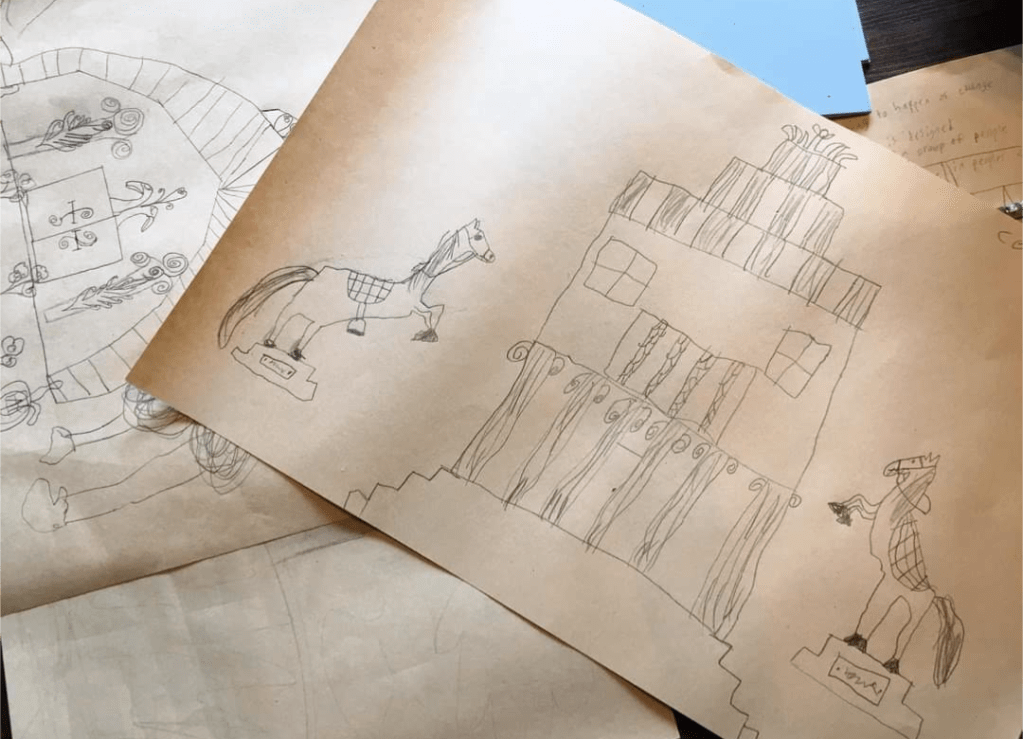 For engineering, we studied how Roman structures were made including the Colosseum, the Parthenon and aqueducts. The kids thought up and drew out how they would have built their structures.