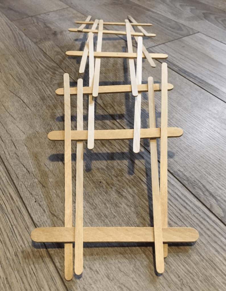 We did an experiment to see how columns would hold up the kids weight by recreating structures with paper cups and baking pans. For another activity, we reconstructed a smaller version of the Leonardo da Vinci bridge using popsicle sticks.