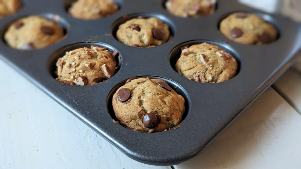 Preheat oven to 350⁰ – in a bowl, mash bananas, then combine eggs, butter, and vanilla. Sift in dry ingredients and incorporate. Pour into buttered or lined muffin tins. Sprinkle on chocolate chips or walnuts or both. Bake for 20-22 minutes.