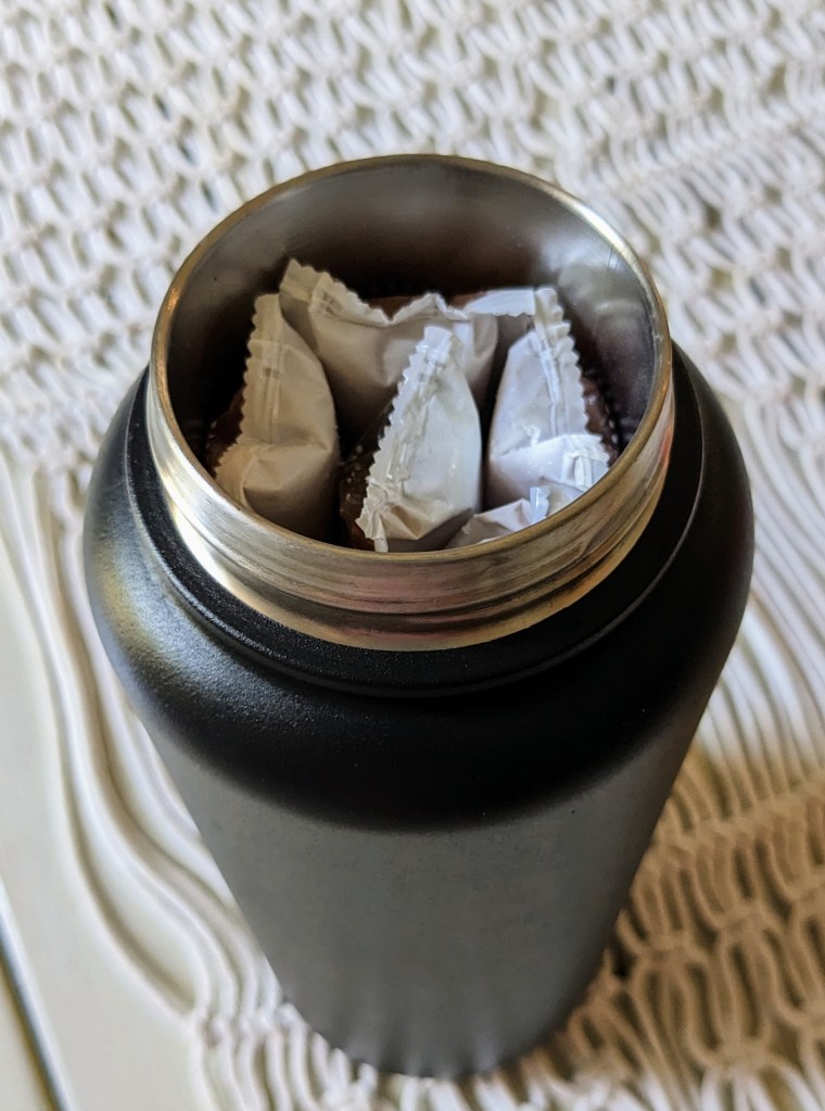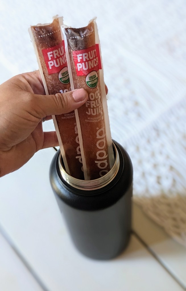 Number 2 is cool treats. Hanging by the pool and craving a nice cold popsicle? Another little hack with reusable water bottles is packing cold treats. I store frozen popsicles in a stainless steel water bottle and they keep frozen for a few hours. Of course, my kids never wait that long to enjoy them, but it’s an easy way to pack along a yummy treat to enjoy in the sun.