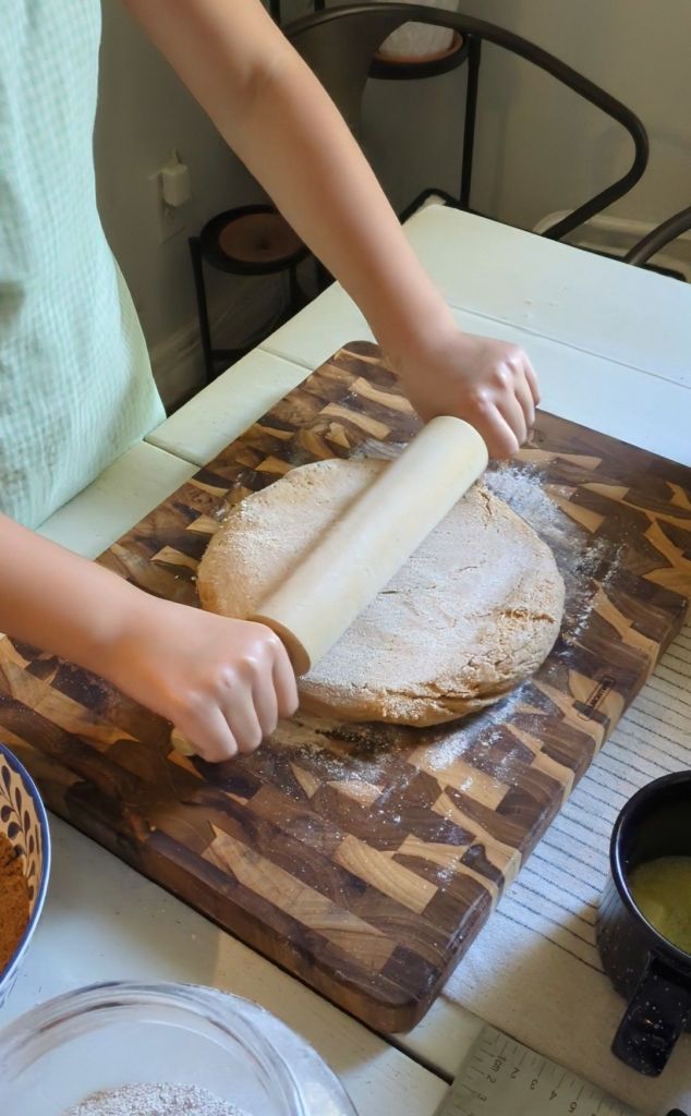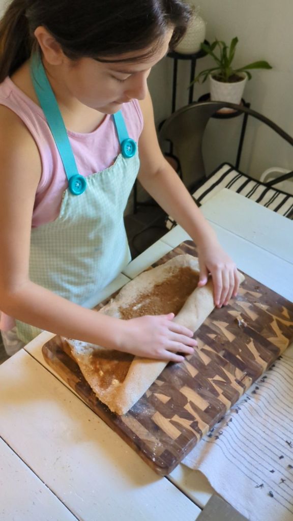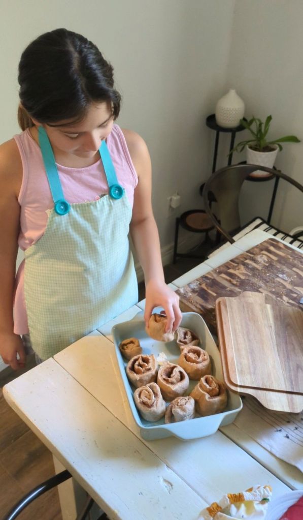 Roll into a log and cut. Depending on the size, you may get anywhere from 8-12 pieces. Place in a 9×13 buttered baking dish and cover. Let sit for 1 hour to let dough rise again.