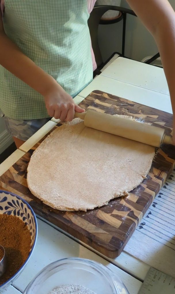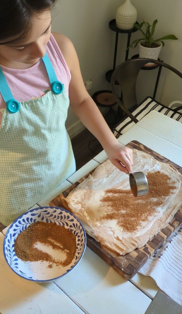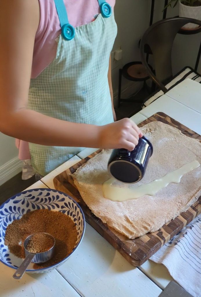 Pour melted butter on dough, then sprinkle on the cinnamon sugar mixture, distributing evenly while leaving about a 1/2 inch border around.