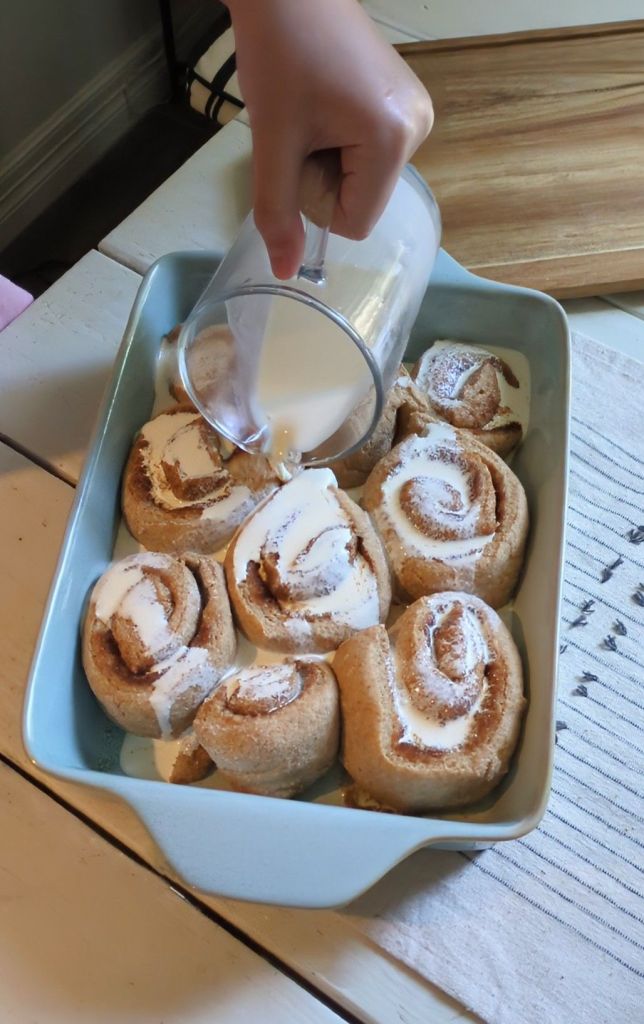 Pre-heat oven to 350⁰. Once dough has doubled, uncover and pour mixture of 1/2 cup heavy cream + 1 tsp. vanilla over rolls before placing in oven.