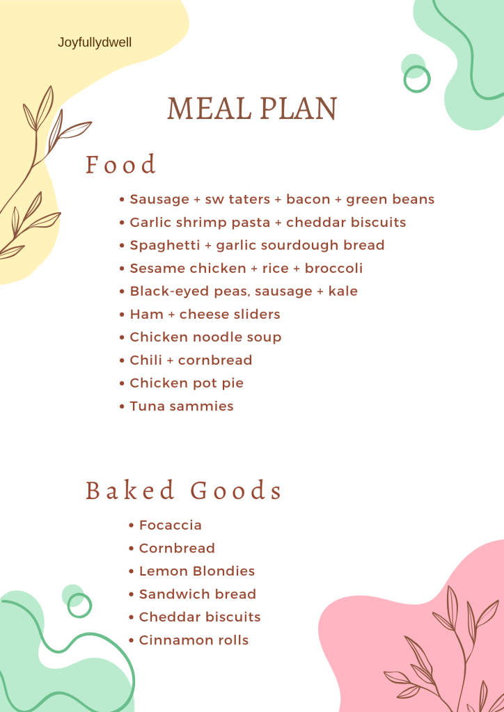 Here’s an example of what a meal plan might look like. I try to plan meals for two weeks out, but sometimes we have a ton of leftovers from the week before and I don’t need to plan as much.