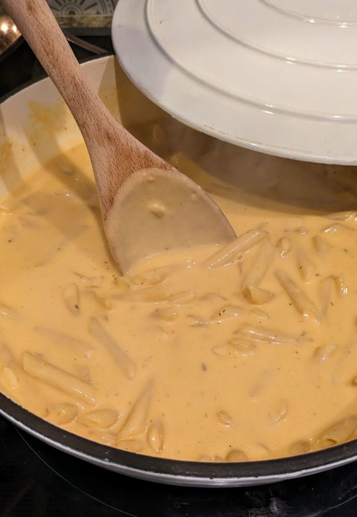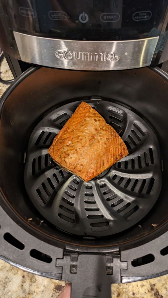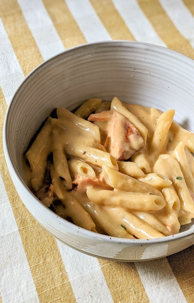 This one incorporates salmon + lobster bisque with penne pasta for a quick meal that seems like you’ve put much more effort into it than it takes. I cook the salmon in the air fryer at 375⁰ for 20 minutes (from frozen). While that cooks, I add 1 lb. of penne pasta (approximately 4 cups) and lobster bisque with 2 cups of water into a large pot and cover. Stir occasionally, the penne will absorb a good amount of the liquid while it cooks. Once the salmon is cooked, crumble it into the pasta mixture. Salt + pepper to taste, add some Parmesan if you like, and voila! Dinner is done.