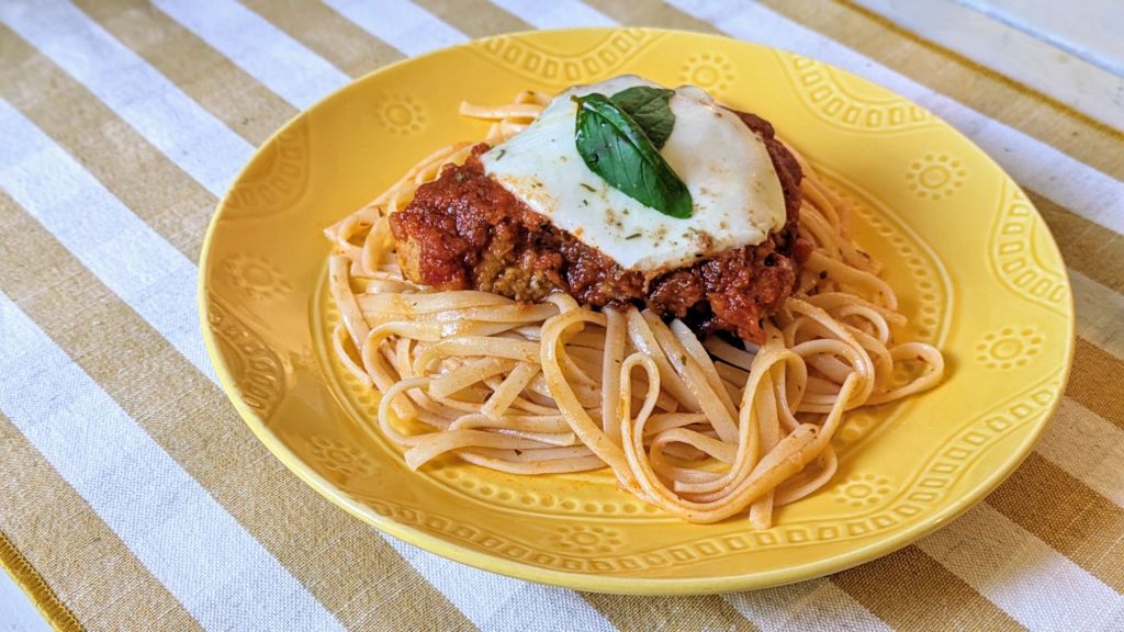 For this one, you could use pre-made breaded tenders or breaded fillets. I just grabbed what Trader Joe’s had in stock. Put chicken in an oiled baking dish, pour over the jar of marinara sauce, top with mozzarella and bake at 400⁰ for 15-20 minutes. While that bakes, prepare the linguine according to package directions.