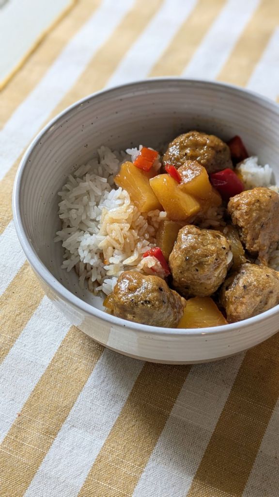 I absolutely love these chicken meatballs I get from Imperfect. They are so versatile and come in handy to whip up a quick and tasty meal. For this dish, I toss them in a pan with some diced peppers, a can of pineapple (juice too), drizzle on the sauce and add some chile if we’re feeling spicy! Serve over steamed rice, and dinner is done in 20-30 minutes.