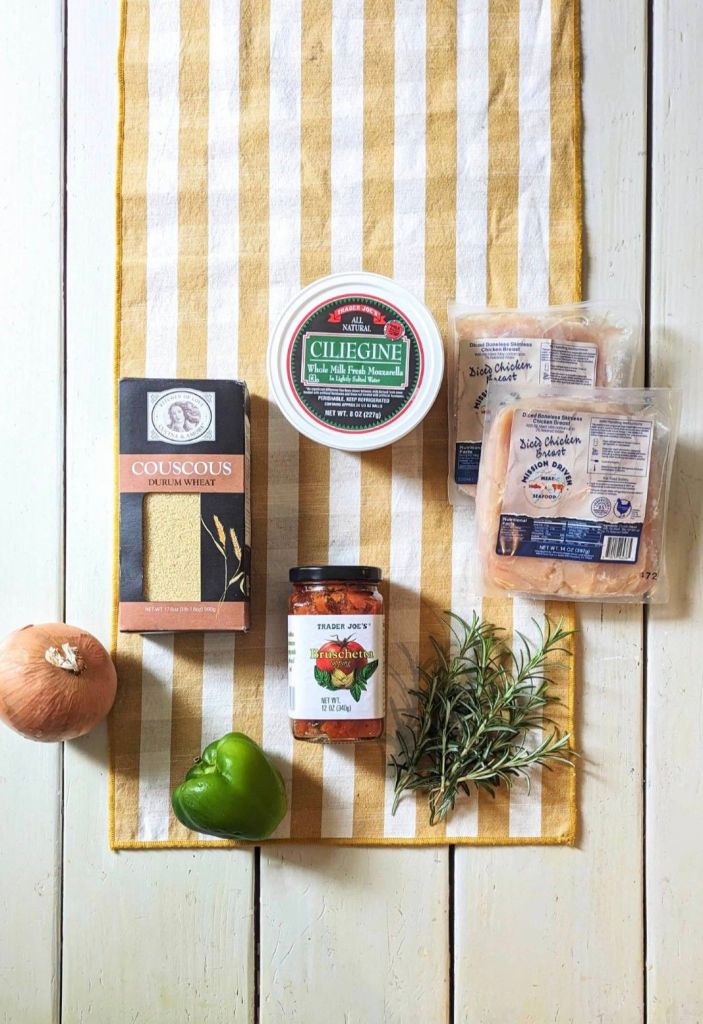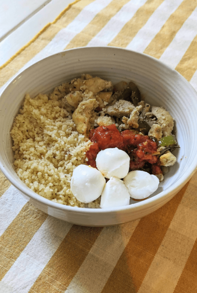 This is a favorite in our household. It’s also yummy as leftovers to take to work the next day. You could use pre-cooked chicken to quicken the prep time on this one, but here, I’m using what I already have on hand. Chicken, couscous, grilled onions and peppers, fresh garden rosemary cooked up and served with a dollop of bruschetta and some mozzarella pearls.