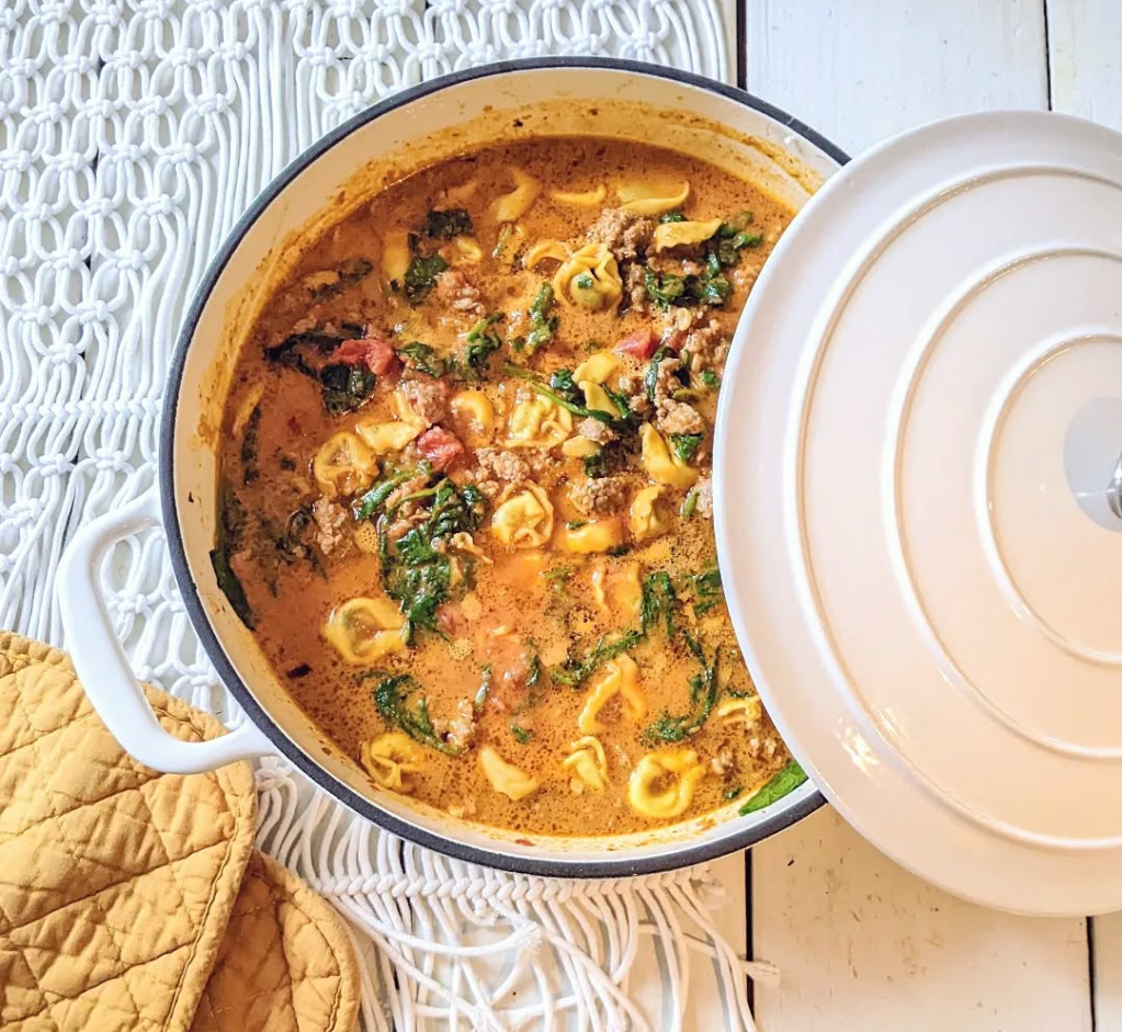 Another easy weeknight Trader Joes meal… One pot creamy tortellini + sausage. 1 lb sweet or spicy pork (I prefer sweet + add some red pepper flakes), 1 container refrigerated stuffed tortellini, 1 bag baby spinach, 1 jar spaghetti sauce, 1/2 block cream cheese, and garlic… Lots and lots of yummy garlic! Brown meat and add everything else, simple as that.